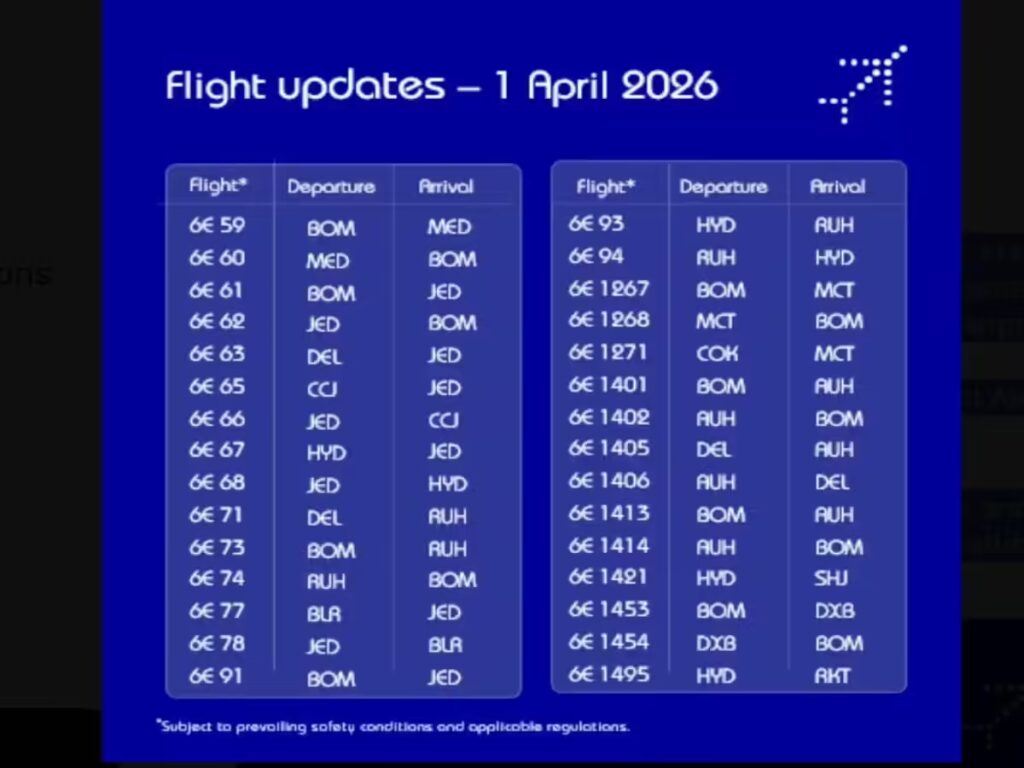 IndiGo has scheduled the below flights to operate on 1st April 2026, with teams working to ensure a smooth travel experience.Updates are being shared on registered contact details, and our support teams remain available to assist you. Your safety and well-being remain our highest priority..”Air India and Air Express update“Air India and Air India Express will together operate 30 scheduled and non-scheduled flights, to and from the West Asia region on 01 April 2026.”This is one of the ways through which Indian airlines are maintaining essential connectivity between India and West Asian nations. The airlines are maintaining all safety protocols and taking care of all measures as passenger and crew safety remains priority. Dubai’s two major airports, Dubai International Airport (DXB) and Al Maktoum International Airport (DWC) are operational but with limited flights. Travellers should know: Travel to the airport only if the flight tickets are confirmedStay connected with their airlines directlyBe ready with their travel documents Allow extra time for security checksThe Indian airlines including Air India, Air India Express and IndiGo, despite all regional tensions and ongoing conflict in the Gulf, continue to operate flights to help stranded passengers while prioritising safety of passengers and crew but in limited numbers.